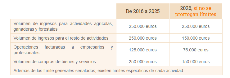 La Orden HAC/1425/2025 se limita a remitirse a los límites establecidos en la Ley del IRPF y en la Ley del IVA para el período impositivo 2026, sin concretar cuantías. De no aprobarse una nueva prórroga legislativa, dichos límites quedarían automáticamente reducidos a los valores ordinarios previstos en la normativa, tal como se aprecia en el cuadro comparativo previamente expuesto.